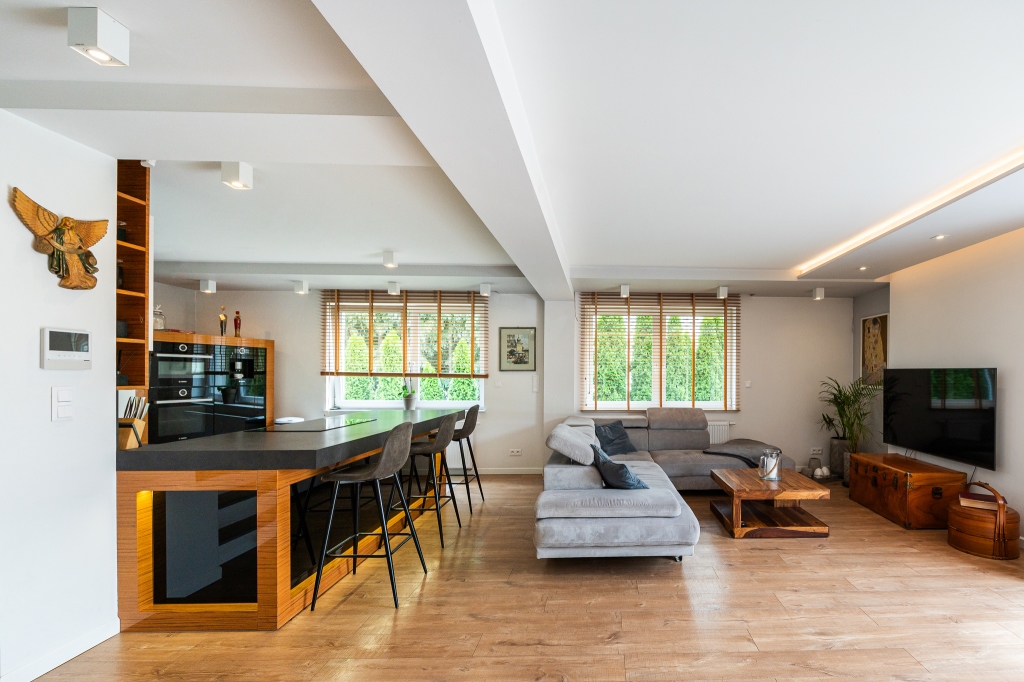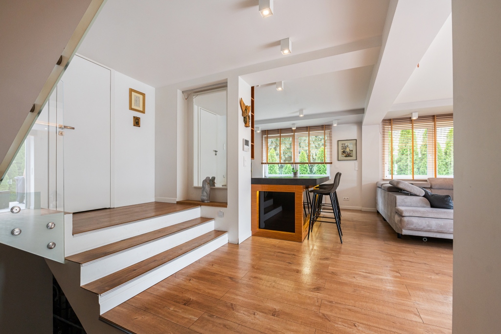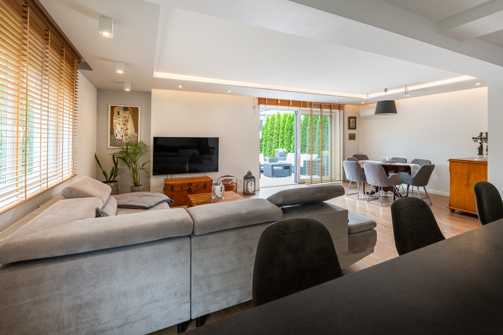Na sprzedaż komfortowy dom w zabudowie bliźniaczej o powierzchni 215 m², położony na działce 400 m², z garażem jednostanowiskowym w bryle budynku. Nieruchomość po generalnym remoncie w 2016 roku – wymienione instalacje, okna, drzwi, elewacja, podłogi i ściany.