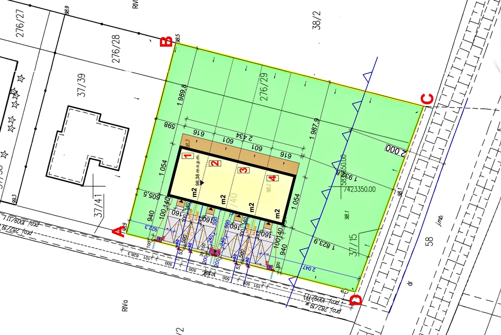 Projekt budowlany zakładający budowę 4 domów jednorodzinnych w zabudowie szeregowej (segmentów), z aktualnym pozwoleniem na budowę. Cicha i spokojna okolica z dużym potencjałem rozwoju.