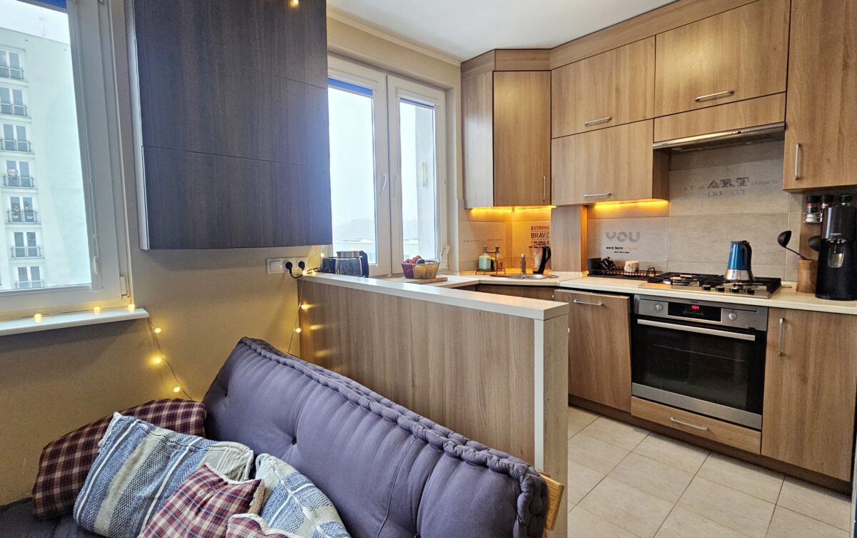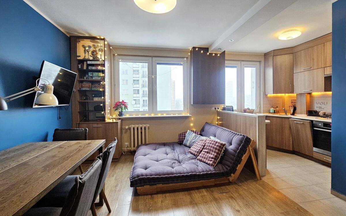 Mieszkanie dwustronne, posiada pięknie doświetlony pokój dzienny połączony z aneksem kuchennym, 2 sypialnie, łazienkę z wc. Kilka lat temu przeszło gruntowny remont ( wymiana instalacji , nowe tynki, stolarka, zabudowa stała wykonana pod wymiar w pokojach , w kuchni